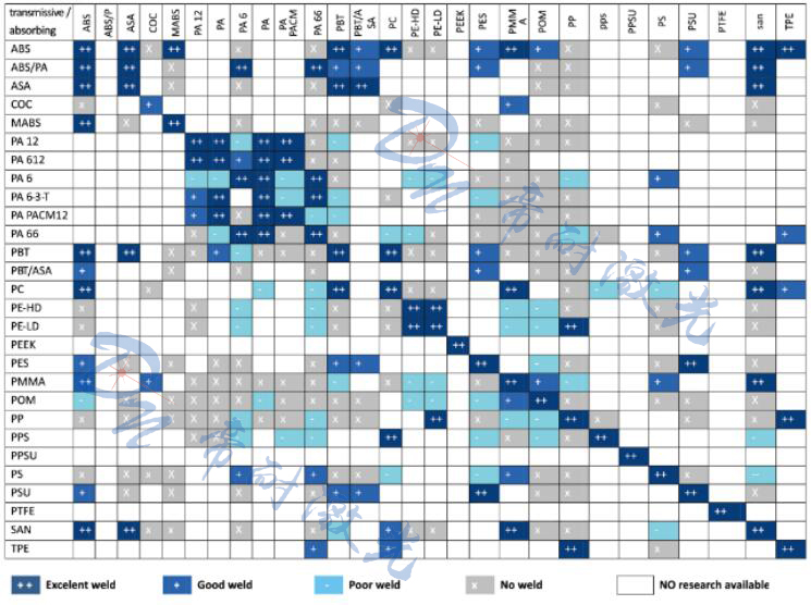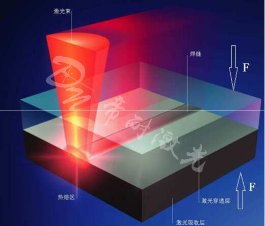 塑料激光焊接原理:通過壓力將兩個待焊接塑料零部件結(jié)合在一起,將一束紅外激光定位于待粘結(jié)部位,激光束透過上層透光材料,被下層材料吸收,吸收的激光能量轉(zhuǎn)換成熱能,由于兩層材料被壓在一起,熱能從吸收層傳導(dǎo)到透光層上,使得兩層材料熔化并結(jié)合。同時由于材料本身的熱膨脹擴張產(chǎn)生內(nèi)部壓力,內(nèi)部壓力與外部壓力共同作用確保了兩部分的堅固焊接。對于產(chǎn)品本身是不吸光的下層材料,需要添加吸收劑進行處理。